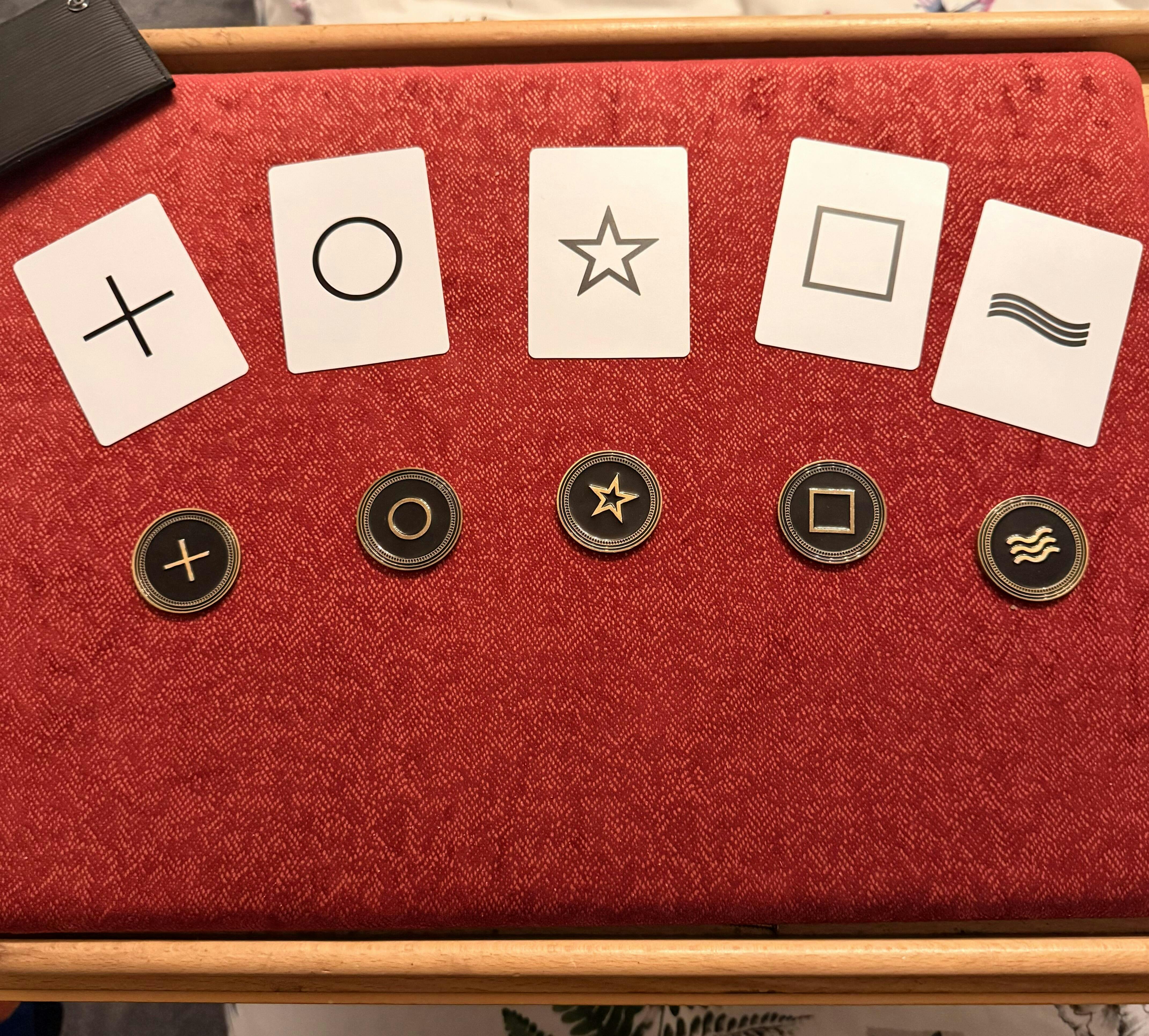 Each coin features one of the classic Zener (ESP) symbols—circle, cross, wavy lines, square, and star—crafted in high-quality iron stamping for a solid, professional finish.