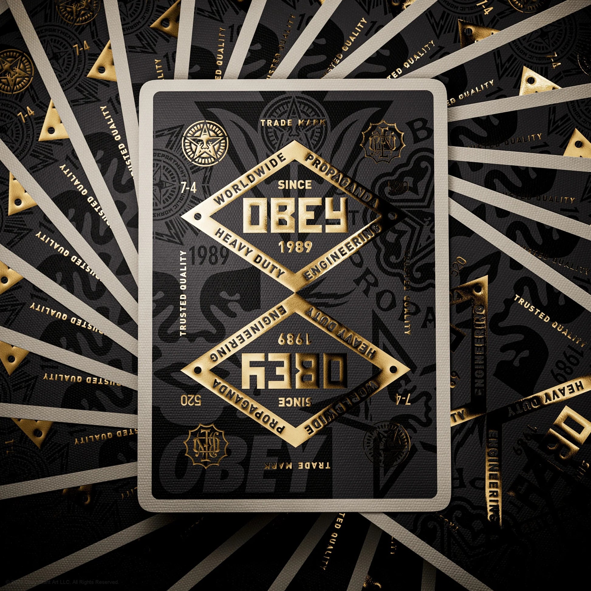 three breathtaking decks, representing three eras of OBEY. Each deck has a unique back design and packaging, printed with multiple layers of foil stamping and sculptured emboss. The three decks share common faces with vibrant, iconic OBEY art over three decades.
