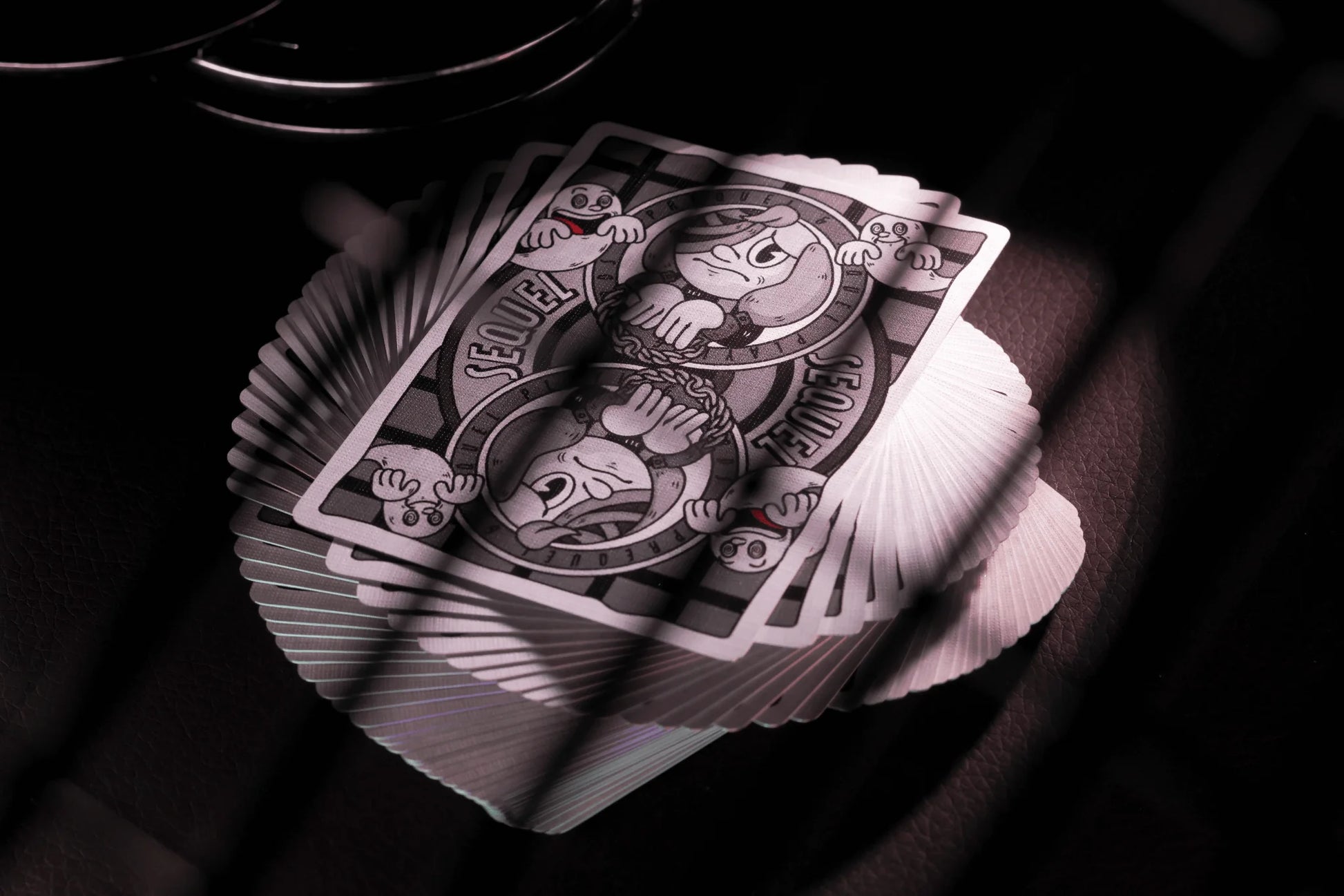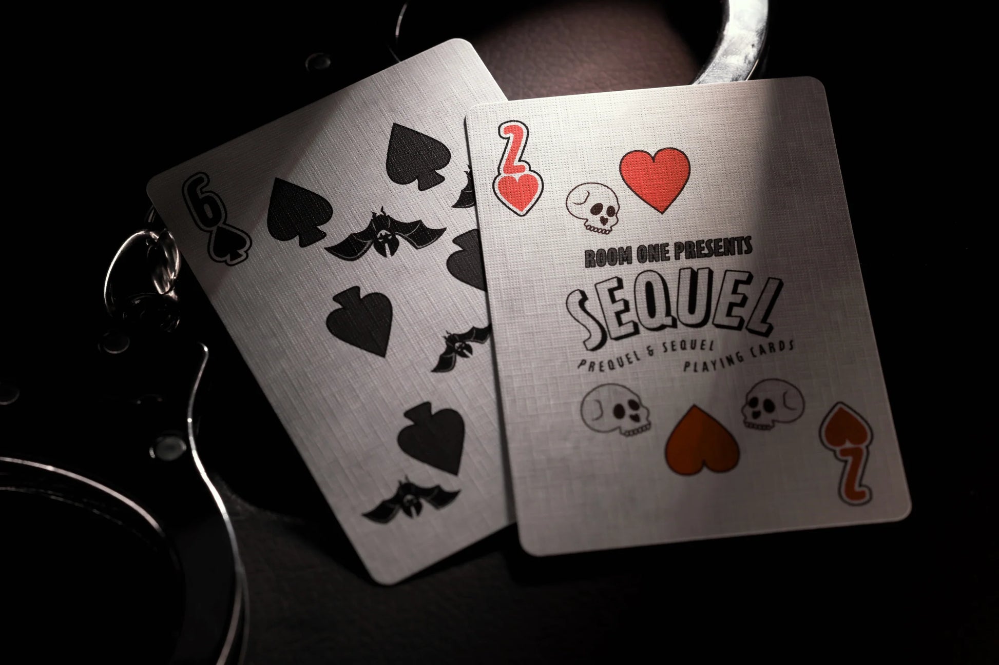 Each number card features atypical pip placements, which are adorned with 4 unique motifs representing the suits. Each motif reflecting the harsh and morbid themes of the darker films produced by studios.