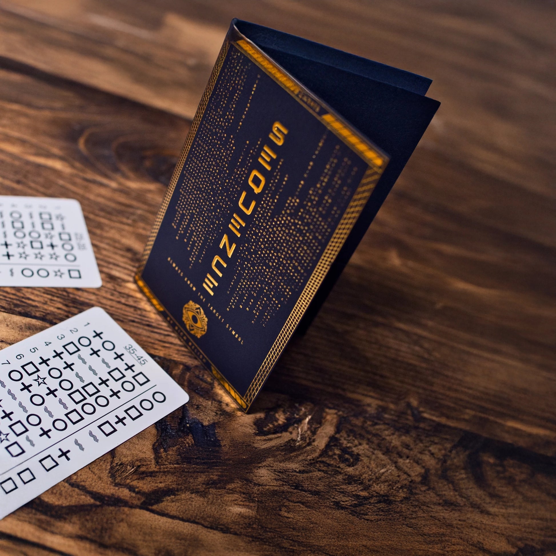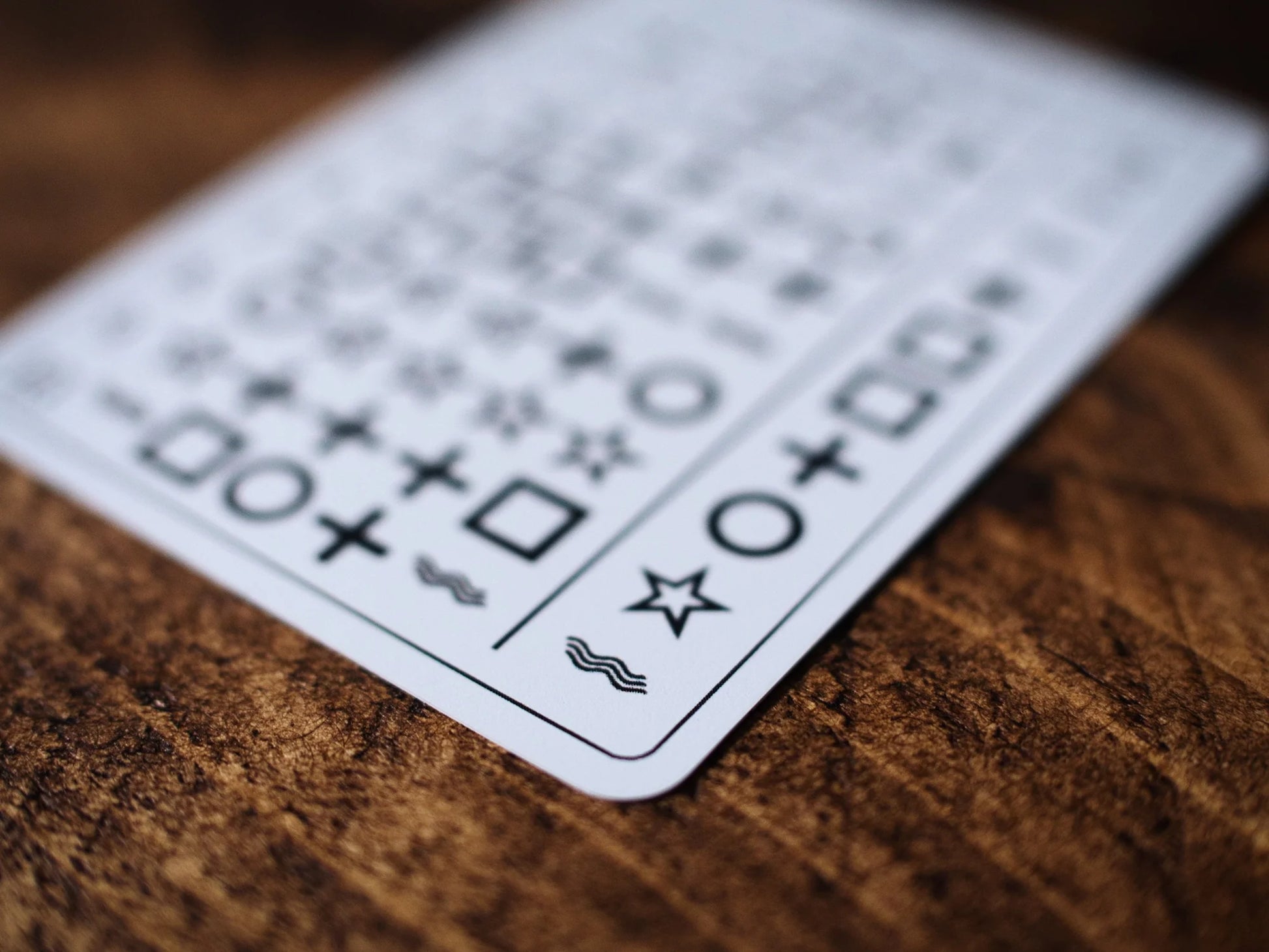 Three cards totalling 60 sequences of ESP symbols are given to your participant. They choose a card, and choose a sequence. Each sequence has its own "target" symbol, which you will attempt to reveal.