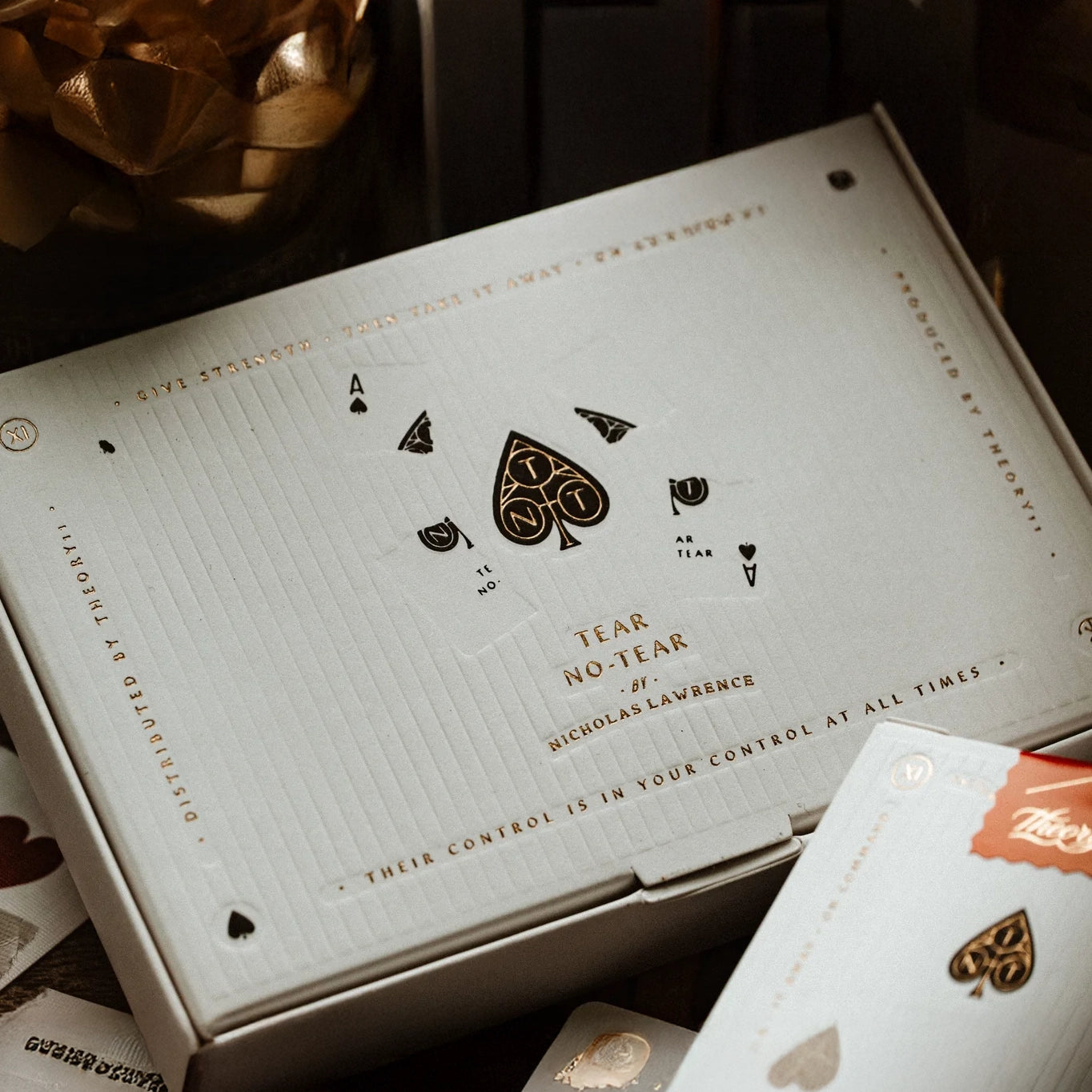 Tear No Tear was created independently by Nicholas Lawrence, and this effect has been in development with theory11 since November 2020. Over the years, a number of other effects have been published with similar plots and methods, although none identical to the gimmick and unique mass production methods utilized in TNT, as performed on television by Dynamo in December 2023 and December 2024. Nicholas wishes to acknowledge the following other publications of similar plots and methods for further study: Weak by Perseus Arkomanis, Tear No Tear Pad by Alan Wong, Silent Control by Rick Lax & Alan Wong, TNT by Marc Sueper